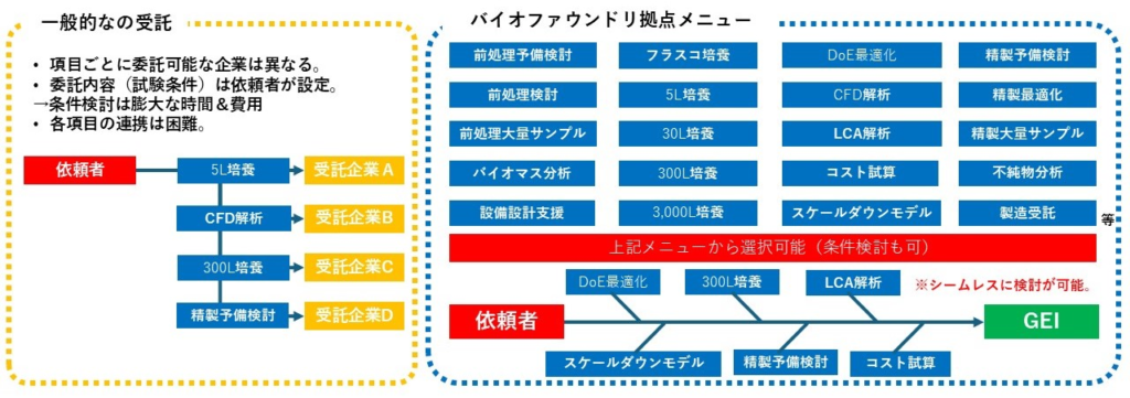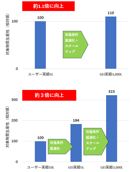 例として案件1では、GEIは培養条件の最適化検討を行った上で3000Lスケールアップ実証を行い、ユーザーの5L発酵槽での実績と比較して約1.1倍生産性が向上した。案件2では、5L培養槽で最適化検討を行った上で3000Lまでスケールアップ実証を行い、ユーザーのデータと比較して、最終的に約3倍まで生産性を向上させた。