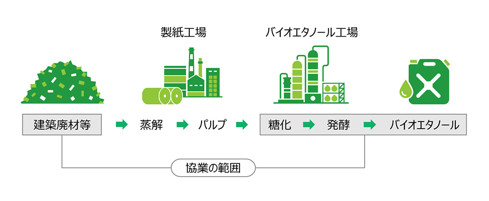 レンゴーは、子会社の大興製紙において、建築廃材等をパルプ原料とするSAF(Sustainable Aviation Fuel、持続可能な航空燃料)向け第二世代バイオエタノールの生産実証事業に取り組んでいる。今後、当該事業を進めるにあたり原料木材チップの安定調達が重要となる中で、住友林業との協業によりCORSIA認証適格原料の調達体制強化を図るとともに、合弁会社でバイオエタノール事業を行い、2027年までに年間2万kLの生産を目指す。