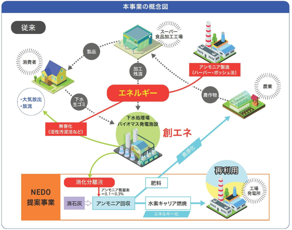 下水汚泥やバイオマス(家畜排せつ物、食品廃棄物、食品工場排水など)を原料としたメタン発酵施設では、0.1~0.3%のアンモニウムイオンを含む多量の消化液が廃液として発生している。現状、主に活性汚泥法による曝気(ばっき)や脱窒処理により窒素濃度を10ppm程度まで下げた後放流されており、この処理には大量の動力(主に電力)が消費されている。近年、消化液を肥料として利用する試みが行われているが、近隣農場の確保や輸送コストの高騰、農作物に吸収されない窒素化合物による地下水汚染、消化液貯留時の悪臭などが問題となるケースもある。また、プラネタリー・バウンダリー(地球の限界)に関する国際チームの研究報告によれば、化学物質としての窒素化合物の環境放出は、既に人間が安全に活動できる限界を超えて危険レベルに達しているとの報告がある。このように、窒素化合物の環境放出をできる限り抑制し、窒素循環型社会を構築することは、世界共通の喫緊の課題と言える。