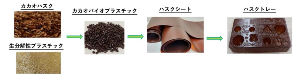 同社は「ひらけ、カカオ。」をスローガンとするカカオの新しい価値創造への取り組みの中で、へミセルロースとの協業により「ハスクトレー」を開発した。カカオ豆の種皮である「カカオハスク」と、生分解性プラスチック原料を混ぜて「カカオバイオプラスチック」に加工し、さらにシート状に加工した後、成型している。植物由来の原料を多く使用しながら、シート状に薄く均一な素材を連続して作る工程が難しく、試行錯誤を重ね、初めて薄い商品トレーへの活用が実現した。今後、他商品への導入も検討していく。
