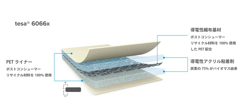 tesa(R) 6066xシリーズは、導電性織布基材にバイオマス由来の導電性アクリル粘着剤を塗工した両面粘着テープ。導電性織布に含まれるPETとダブルライナーにはポストコンシューマーリサイクル材料 (PCR) を100%使用している。また、粘着剤に含まれる炭素のうち75%はバイオマス由来で、再生可能な自然素材を原料としている。