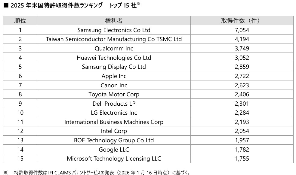 米国の特許専門調査会社IFI CLAIMSパテントサービスによると、2025年に米国特許商標庁(USPTO)に登録された特許数は、キヤノンが7位となった。世界10位以内を維持する企業の中で、キヤノンは、最長となる42年連続でその記録を継続している。