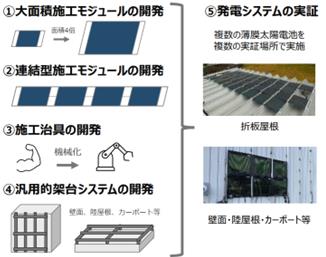 この開発では、2025年度~2027年度にかけて、フィルム型太陽電池の大型化や長大化を実現するモジュール(フィルム型太陽電池と架台を組み合わせたもの)を開発するほか、現場の作業負担を軽減し施工速度の向上を図るために、施工性と構造安定性を両立する治具(留め具や締め具)の開発、多様な形状の屋根や壁といったあらゆる設置環境に適応可能な架台システムの開発を行う。日揮はこれらの開発により、シート工法の強みである施工性を更に向上させ、従来型のシリコン製太陽電池と比較して約35%の施工コスト削減を目指す。