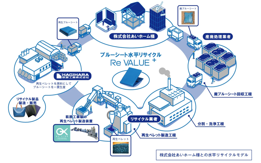 このプロジェクトでは、あいホームの年間約250棟の着工に伴い、約15トン分のブルーシートがリサイクル対象となる予定。使用済みシートは宮城県内の産廃処理業者により回収・中間処理後に保管、萩原工業指定工場まで運搬の後、萩原工業が有価で買い取り、岡山県内の協力企業へ運搬される。協力企業にて分別・洗浄を行い、再生ペレットとして原料化。その後、萩原工業が新たなブルーシートを生産し、再びあいホームの建築現場で活用される。