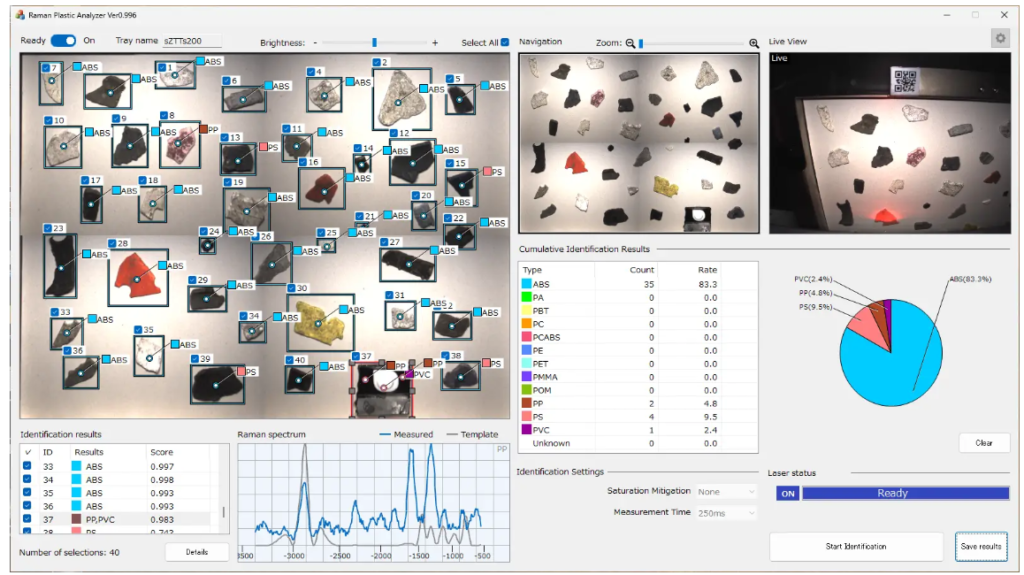 新製品は、ラマン分光法を用いた独自開発のレーザースキャン方式により、黒色を含めた複数のプラスチック片の材質を簡易かつ高精度に一括判別できる装置。さまざまなプラスチック片の中から、特定のプラスチックの材質やその割合を迅速に調べられるため、リサイクル業の幅広い現場における品質チェック・分析工程の大幅な効率化が可能。分析結果をフィードバックすることで、回収・選別条件の最適化を行うなど、さらなる高純度化に向けた活用も見込め、マテリアルリサイクルの最大化に貢献する。