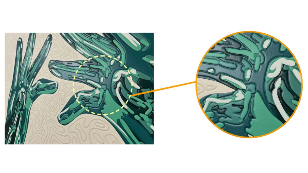 高精度な新開発のプリントヘッドにより描き出された豊かな色彩のフルカラー印刷と立体的なテクスチャの組み合わせは、作品に奥行きを与え、アーティスティックで存在感のある唯一無二のグラフィックを創り出す。しかも、フルカラーのエンボス表現を一点から必要な枚数だけ製作できるため、画一的なデザインで在庫リスクのある既製品を使用することが多い、インテリア装飾の可能性を大きく広げる。