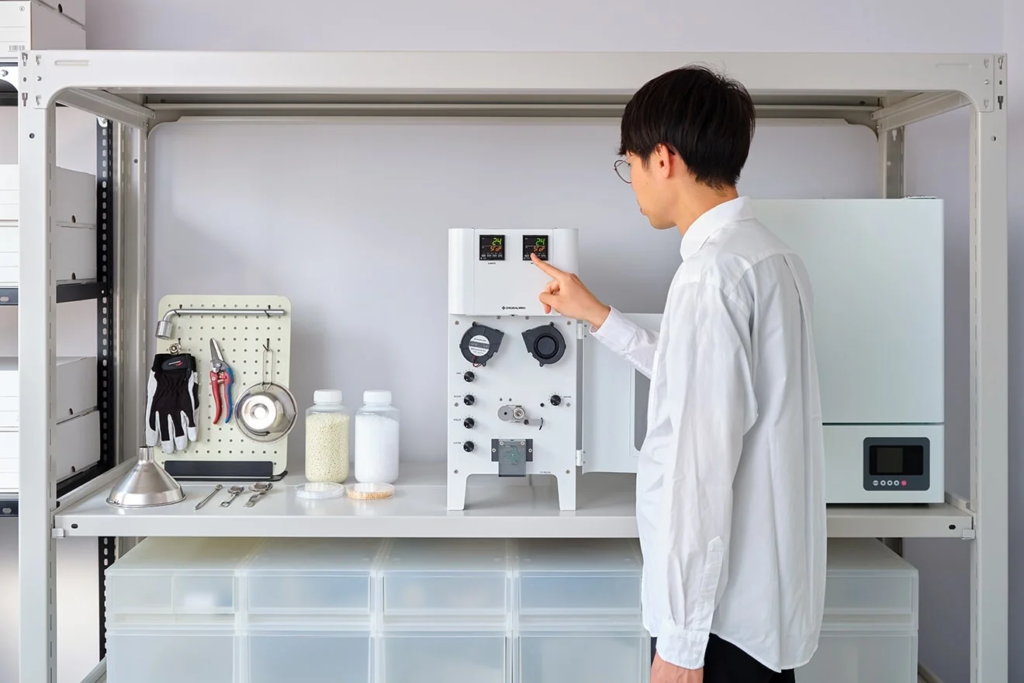 「CONERI(コネリ)」は、プラスチック製品の原料となる樹脂ペレットを、机の上で手軽につくれる機械(ペレタイザー)。本来は別々の大型装置で行う「混練・押出・造粒」の工程を、コンパクトサイズの1台に集約。ペレットの調色やこれまでにない材料の配合などをその場で試しながら、スピーディに新しい“素材”を生み出すことができる。