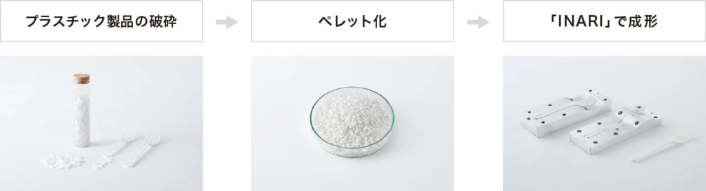 細かく砕いたプラスチック製品をCONERIに投入すれば、新たなペレットとして再生することができる。さらに、射出成形機INARIを使えば、再生したペレットを用いた成形まで可能。CONERIは、廃プラスチックのリサイクルはもちろん、貴重な材料の再利用や、3Dプリンターから発生するサポート材の再利用などにも使える。
