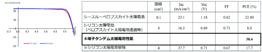 自動車のルーフに太陽電池を設置する場合、ルーフ形状に沿う必要がある。両社は、フィルム型のペロブスカイト太陽電池を用い、シースルー型としては極めて高い変換効率である22.4%を達成した。22.4%の変換効率と81%の赤外線透過率を有するフィルム型ペロブスカイト太陽電池は世界でもこれまでに報告例が無く、両社の極めて優れた技術力を証明することができた。このフィルム型ペロブスカイト太陽電池と結晶シリコン太陽電池を組み合わせることで、タンデム型(4端子)として合計で30.4%という世界最高クラスの変換効率を達成することができた。