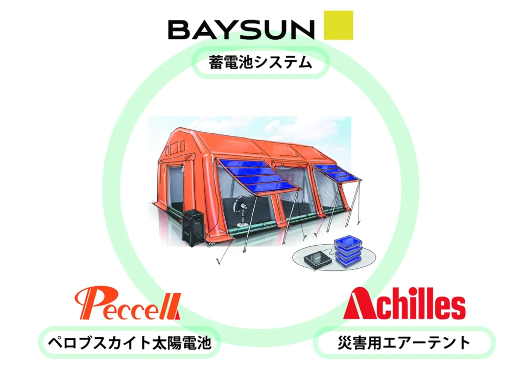 【ペロブスカイト太陽電池】ベイサン、ペクセル・テクノロジーズとアキレスとの共同で、11月8日・9日開催の新横浜パフォーマンスにて災害用エアーテント、リチウムイオン蓄電池による実証実験披露