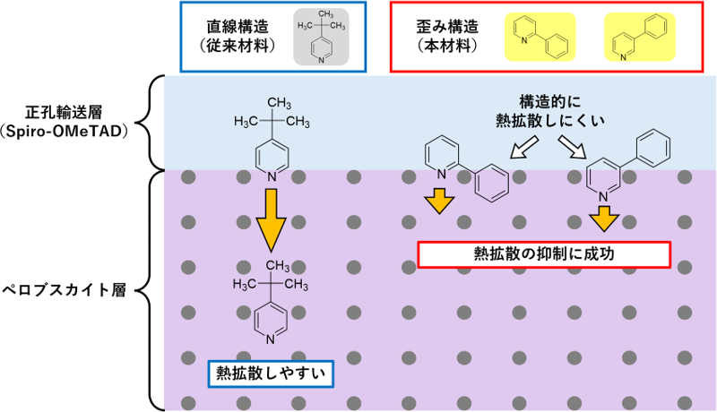 従来用いていた4-tert-ブチルピリジンは、窒素(N)と炭素から構成されるピリジン環に炭素4個からなるtert-ブチル基(置換基)を持ち、窒素(N)の位置に対して、置換基が180度反対側に接続した分子構造が特徴(図1左)。ペロブスカイト層においては、分子は窒素(N)の方向に熱拡散すると考えられる。熱拡散する方向に対して、分子構造が直線的な構造のため、ペロブスカイト層に容易に熱拡散することが判明した(図2左)。