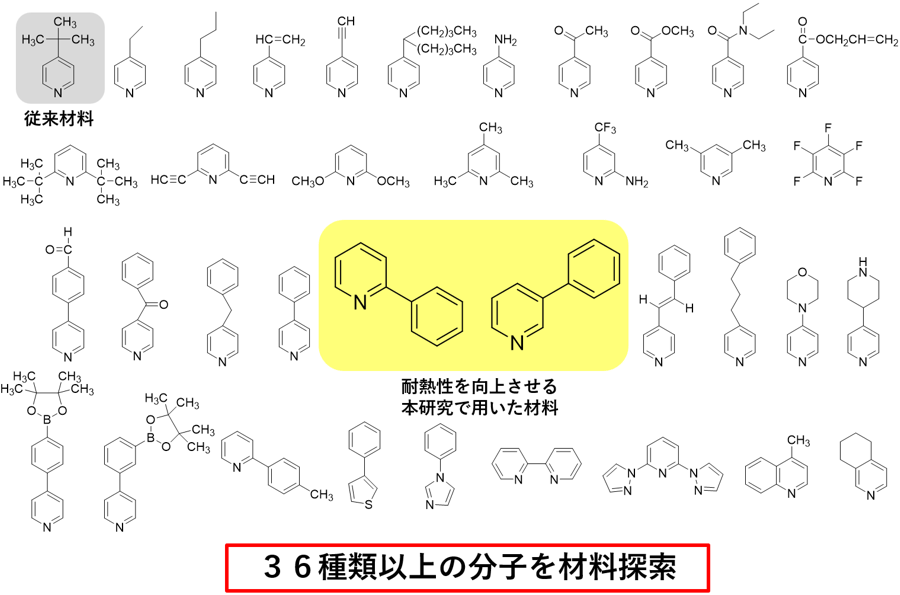 これらの材料探索の結果、耐熱性向上にはピリジン環の置換基の位置が重要な因子であることが明らかになった。特に、ピリジンの窒素(N)原子に対して置換基であるフェニル基が60度(図3黄色枠左)または120度(図3黄色枠右)の位置にある場合に高い耐久性を示すことが分かり、耐熱性を向上させるための分子構造の設計指針を得ることに成功した。