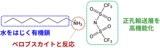 PSCの実用化には、高い光電変換効率と優れた耐久性との両立が課題となっている。特に、光を吸収して電荷(正孔と電子)を生成するペロブスカイト層は、食塩(NaCl)などと同様にイオンからなる結晶(イオン結晶)であるために、水分や湿気により劣化するという問題がある。また、この太陽電池はペロブスカイト層を正孔輸送層と電子輸送層で挟み込んだ積層構造になっているため、ペロブスカイト層以外の構成層の開発も重要になる。その中で、正孔輸送層の構成材料である正孔輸送材料は単体ではほとんど機能しないが、添加剤を導入することでペロブスカイト層から正孔を効率良く取り出せるようになり、太陽電池として機能させることができる。しかし、従来の添加剤では、時間がたつと添加剤がペロブスカイト層を劣化させて耐久性が低下するという問題があり、実用化に向けて、劣化を引き起こさない添加剤の開発が求められていた。
