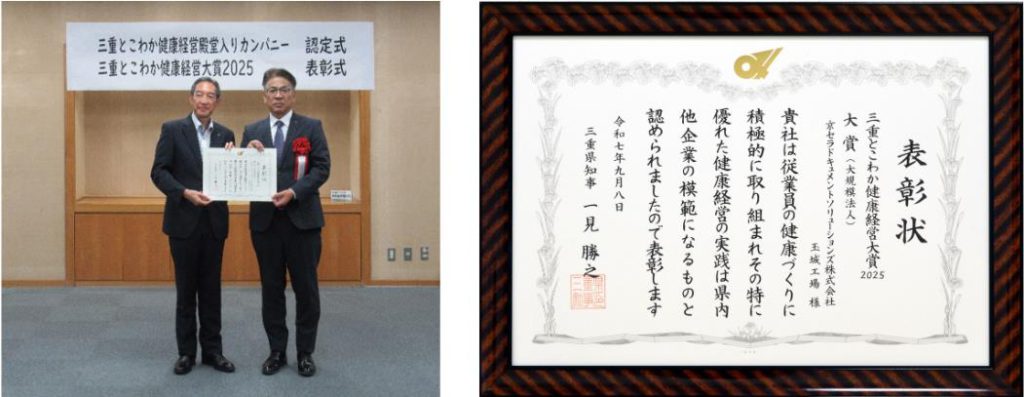京セラドキュメントソリューションズ三重・玉城工場(木元恵三工場長)は、2025年8月26日に三重県が推進する「三重とこわか健康経営大賞2025」を受賞した。