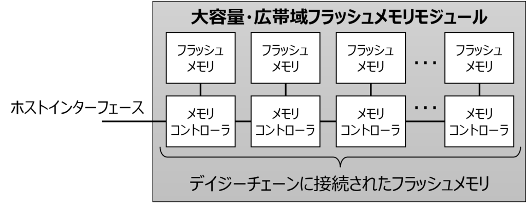 メモリモジュールの大容量化と広帯域化を両立するために、複数のフラッシュメモリをバス接続する代わりに、コントローラを介して数珠つなぎするデイジーチェーン接続(図2)を採用。これにより、フラッシュメモリの数を増やしても帯域が劣化せず、従来の限界を超えた大容量化を実現した。