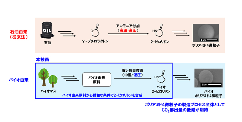 従来、ポリアミド4の原料である2-ピロリドンは、石油由来の原料から製造されてきました。これに対し東レは、糖などの主要バイオマスを起点とした2-ピロリドン合成法の研究開発に取り組み、バイオ由来原料から2-ピロリドンを合成することに成功しました。本技術で製造される2-ピロリドンを重合・加工したポリアミド4微粒子は、従来品と変わらない粒径、形状を実現でき、最終製品への影響を与えることなくバイオ原料化することが可能。加えて本技術は、従来の石油化学プロセスと比較して温和な条件で反応が進行するため、原料からポリアミド4微粒子を製造するまでのプロセス全体として二酸化炭素(CO2)排出量を低減する効果が見込まれる。