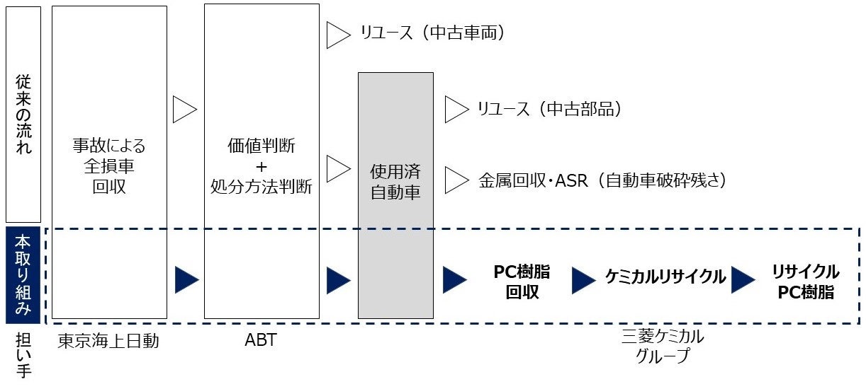 三菱ケミカルグループ、東京海上日動火災保険およびABTは、2023年2月から国内初の取り組みとして、東京海上日動火災保険およびABTが持つ使用済み自動車処理のネットワークを活用し、テールランプ等のアクリル樹脂を回収する実証実験を行っている。