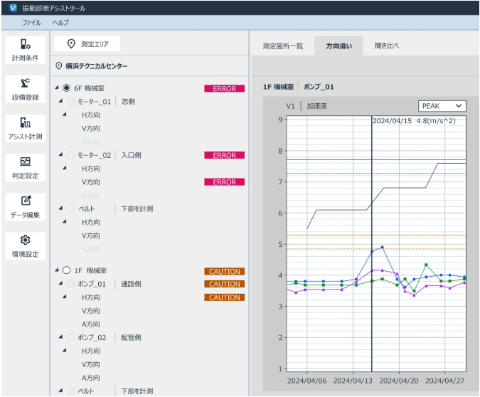 同製品の計測・データ管理を支援するPC用アプリケーション機能。あらかじめ計測条件や設備情報を登録し、本体に送信することで、現場で機械ごとに条件を設定する手間を省き、効率的な点検が可能になる。また、本体で取得したデータをPCに取り込み、傾向管理グラフの表示や振動音の再生が行える。これにより、数台の機械から設備診断に取り組み、定期的な傾向管理を通じて、的確なメンテナンス判断を行う体制の構築を支援する。