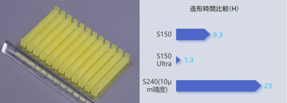 特にS150 Ultraは、S150と比較して最大約9倍、S240(10μm精度)と比較して最大約20倍の造形速度を実現し、生産性の大幅な向上に貢献する。