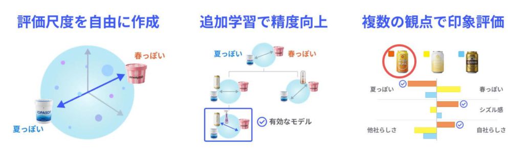 パッケージデザインといった視覚情報や商品名などの言語情報が消費者へ与える印象を定量的に評価するWebサービスだ。消費者の大量なアンケートデータをもとに学習したAIツールであり、従来、勘や経験に頼る部分が多かった曖昧な印象評価を科学的・定量的に実施することが可能になる。主に一般消費者向け商材メーカーにおいて、新商品開発のシーンで活用されている。