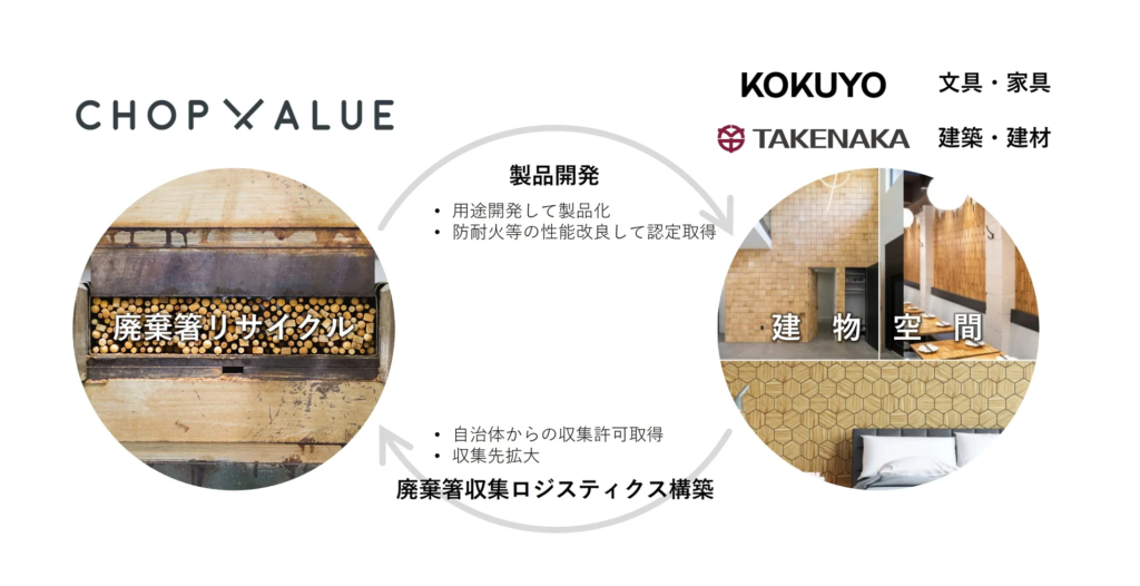 コクヨ、竹中工務店のそれぞれの事業所の割り箸の回収に関する実証試験を行い、日本における適切な回収体制・ロジスティクスの構築を目指す。ChopValue Japanの技術を活用し、コクヨは家具・什器の、竹中工務店は建材の新用途・新製品の開発を進める。