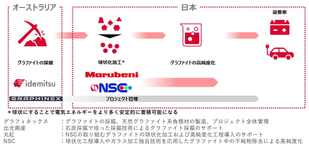 出光興産は今回の協業を通じ、グラフィネックスが保有する豪州クイーンズランド州の高品位グラファイト資源を活用し、日豪間で資源開発から負極材製造・市場供給まで一貫した天然グラファイト系負極材の新たな供給網構築を目指す。今後4社で、天然グラファイト系負極材の製造拠点の候補地検討などの事業化に向けた具体的な協議を進める。