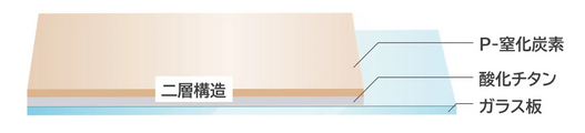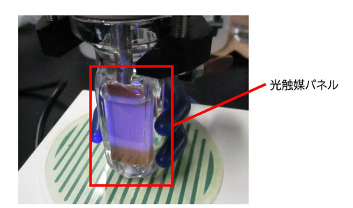 ・ホウケイ酸ガラス平板上に光触媒を固定化するため、金属酸化物(酸化チタン)層を生成し、その上に可視光を吸収する有機半導体である窒化炭素の層を重ねる二層構造を採用。これを固定化することで、人工光触媒のパネル化を実現