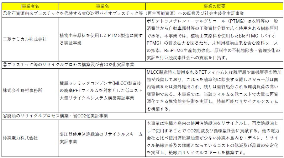 「令和7年度脱炭素型循環経済システム構築促進事業(うち、プラスチック等資源循環システム構築実証事業)(補助)」の一次公募に対し、5件の応募があり、申請書類による事前審査及び有識者で構成される評価審査委員会による審査を行った結果、以下3件(プラ代替素材事業1件、プラリサイクル事業1件、廃油リサイクル事業1件)の事業が選定された。