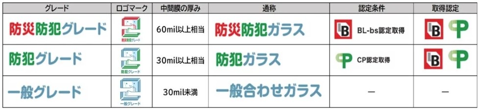 板硝子協会は、合わせガラスについて、新たに「防災防犯グレード」「防犯グレード」「一般グレード」の3つのグレード制を導入し、各グレードの機能を明確にした。