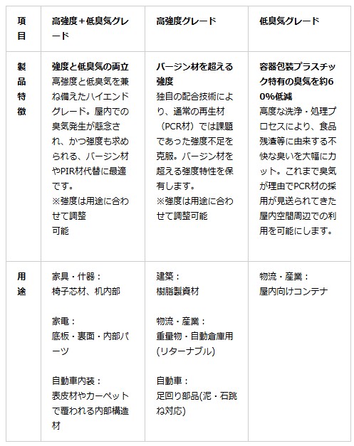 洗浄プロセスの改良により、従来の使用済みの容器包装プラスチック由来のPCR材と比較して臭気を約60%低減させることに成功した※。これにより、臭気の問題で敬遠されていた家具、家電部品、自動車の内装材など、屋内外問わず多様な製品用途での利用が可能。