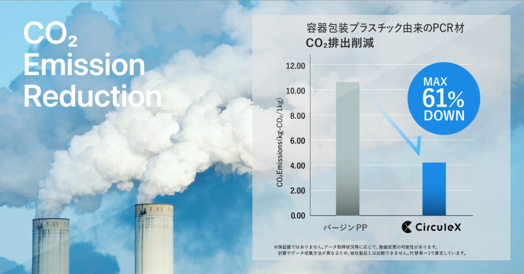 マテリアルリサイクルが出来ない使用済みプラスチックは、主に燃料として利用し、その排熱を回収するサーマルリカバリーという方法で燃焼を伴う焼却処理されてきた。「CirculeX」は、バージンプラスチックと比較して、1kg当たり最大6.43kg(最大61%相当)※のCO2排出量を削減。