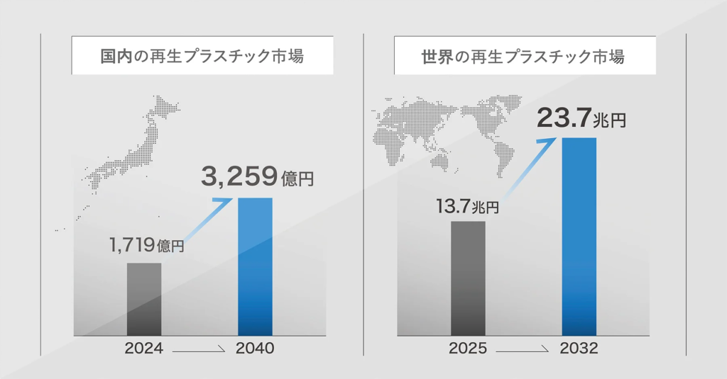 現在、各国でプラスチックの資源循環に関する法規制が強化されている。EUでは「包装・包装廃棄物規則(PPWR)」に基づき2030年までに包装廃棄物の55%をリサイクルする目標が設定され※1、英国では再生材含有率が30%未満のプラスチック製品に対する課税制度が導入された※2。日本国内においても、廃プラスチックの処理は依然として焼却に大きく依存しており、マテリアルリサイクル率はわずか20%にとどまっている※3。プラスチック資源循環促進法に基づき2030年までにプラスチックの再生利用を倍増させる目標が掲げられるなど※4、プラスチックの再生利用の拡大が強く求められている。こうした潮流を受け、国内の再生プラスチック市場は、2024年には約1719億円、2040年には約3259億円規模※5、世界の再生プラスチック市場は、2025年には約13.7兆円、2032年には約23.7兆円規模に達すると予測されている※6。 このような市場の環境下において、高品質な産業廃棄物由来の再生材は需要の急増に対して供給が逼迫している上、調達難易度は上昇しており、価格も高騰している。一方、使用済みプラスチック由来のPCR材は、食品残渣に起因する臭気や材料の強度不足などの品質課題が残るため、国内で再商品化される製品用途は主に使い切りのパレットや土木建築用資材の充填剤などに限定されており、法改正に伴う回収品目の拡大により2030年には回収量が170万トンまで増加する見込みとされているが※7、供給が限られる市場である。