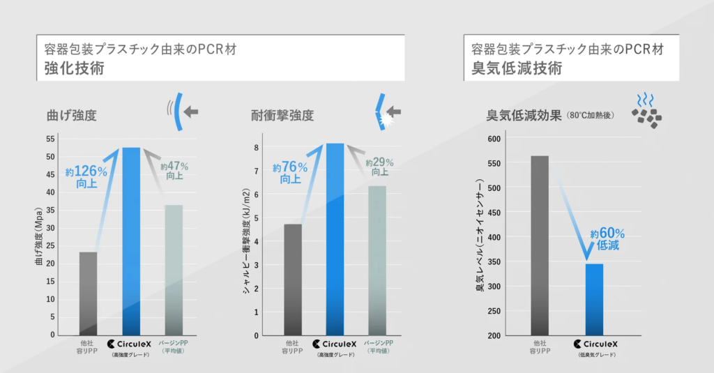 独自の配合・混錬技術で改質を図り、「CirculeX」は使用済みの容器包装プラスチック由来のPCR材でありながら、曲げ強度は、従来のPCR材と比較して約126%、バージンプラスチックと比較して約47%、耐衝撃強度は、従来のPCR材と比較して約76%、バージンプラスチックと比較して約29%、従来のPCR材やバージンプラスチックを上回る強度を実現した※。建築資材、物流資材、自動車部品など、耐久性が求められる様々な分野での利用が可能。