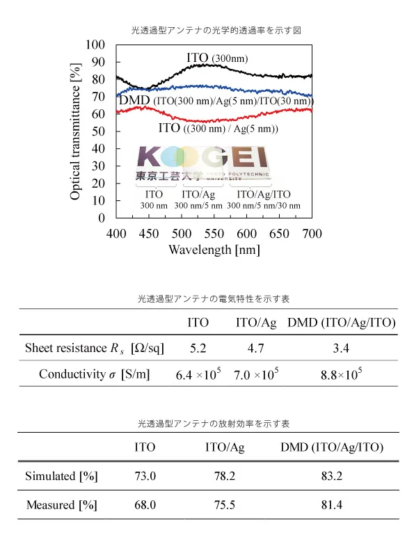 従来、国内外で発表されてきた透明なアンテナの多くは、ITO(酸化インジウムスズ・スマホのタッチパネルなどに使われる素材)透明導電膜を用いたものであり、放射効率は50~60%程度に留まるなど、高いアンテナ放射効率を得ることが困難でった。今回の研究では、金(Au)や銀(Ag)などの導電率の高い金属薄膜を、ITO などの誘電体薄膜で挟み込む「誘電体-金属-誘電体(Dielectric-Metal-Dielectric; DMD)」構造を採用し、放射効率と透明性がともに高くなる構造を明らかにした。これにより、高い放射効率と高い透明性の両立を実現している。