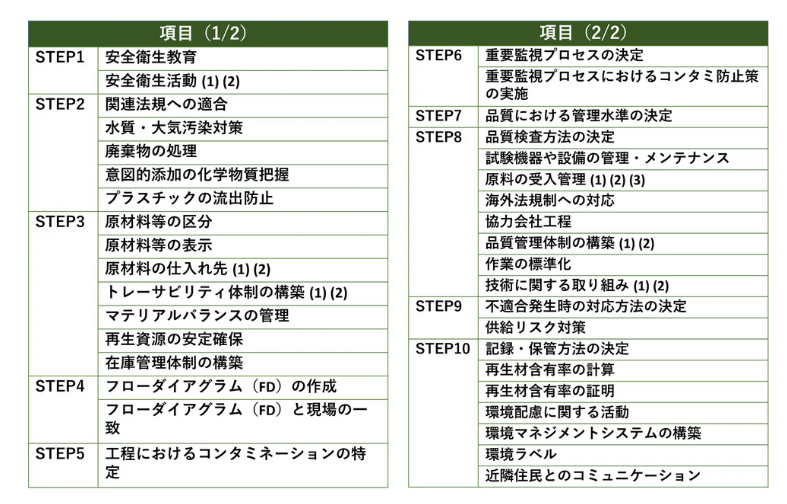 なお、パイロット認証では、「再生原料製造」と「成形用再生材料製造」のカテゴリについて、認証基準(ver.0)を用いてパイロット審査を行った (項目の概要は下図参照)。また、SuMPOが策定したSPC認証機関認定基準に照らして認証機関を認定した。