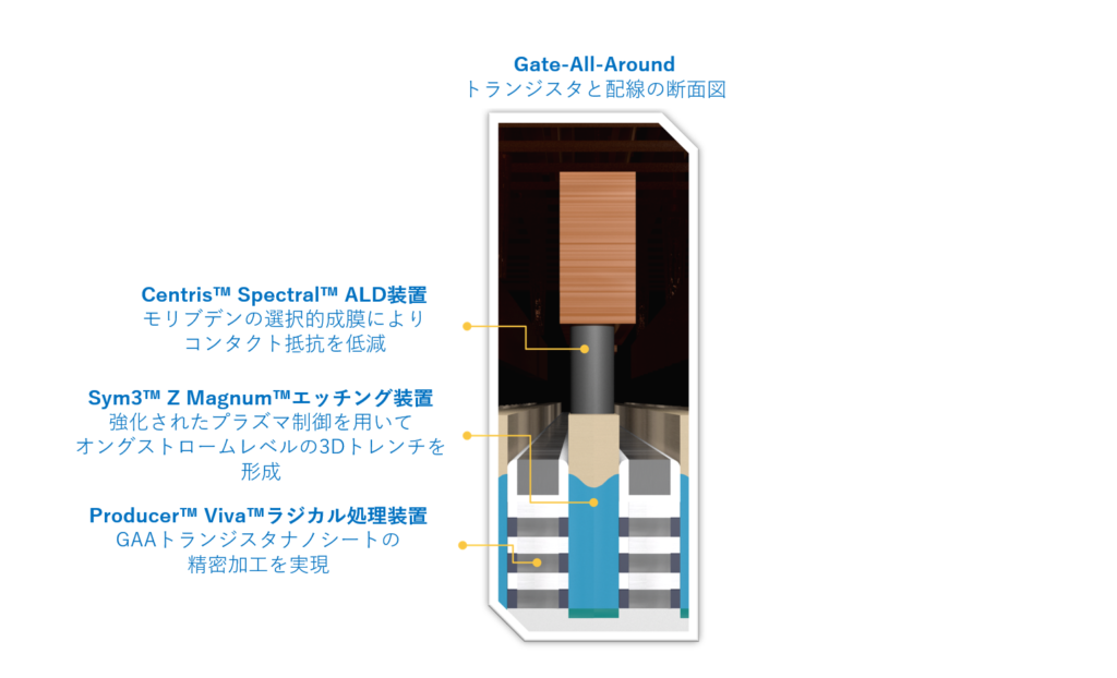 ・Spectral™原子層堆積装置はトランジスタのコンタクト金属を現行のタングステンからモリブデンに変え、トランジスタと銅配線ネットワークをつなぐ接点の電気抵抗を低減