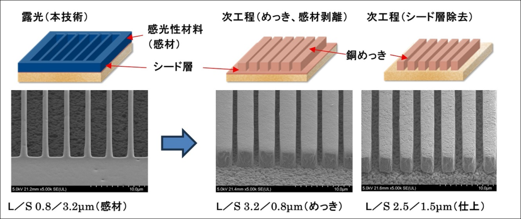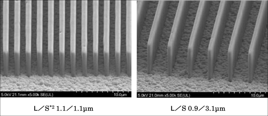 (感光性材料への回路パターン焼き付けおよび現像後走査型電子顕微鏡写真)