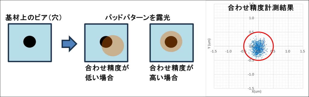 ダイレクト露光装置は、フォトマスクの設計や製造にかかる時間とコストを削減し、先端パッケージの開発期間の短縮や量産時のプロセス効率化を可能とする特徴がある。しかし、先端パッケージの製造に適用するには、配線を微細化するための解像性や、正確な位置に露光するための位置合わせ精度の向上が必要であった。