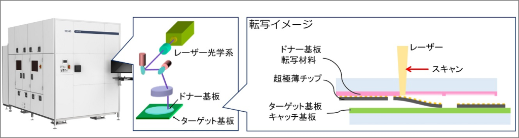この技術は、マイクロ発光ダイオード(LED)をディスプレー基板に実装する際などに使用される「レーザー転写技術」を応用したもので、先端半導体に使用される厚み20µm以下の半導体チップや、次世代光集積回路に使用される厚み1µm以下の化合物チップを、量産時に求められる精度を保ちながら、従来比10倍以上の効率で生産を可能とした。