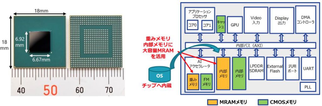 大容量の不揮発性MRAMを実証チップに内蔵したことにより、起動(BOOT※6)時にかかる時間を極めて短くできるほか、メモリへの書き込み/読み出しにかかる時間や電力を大幅に削減できるなど、これまでと一線を画した特徴が得られ、さまざまなAI応用の場面でこれまでにないユーザー体験やメリットを生み出すことが想定される。