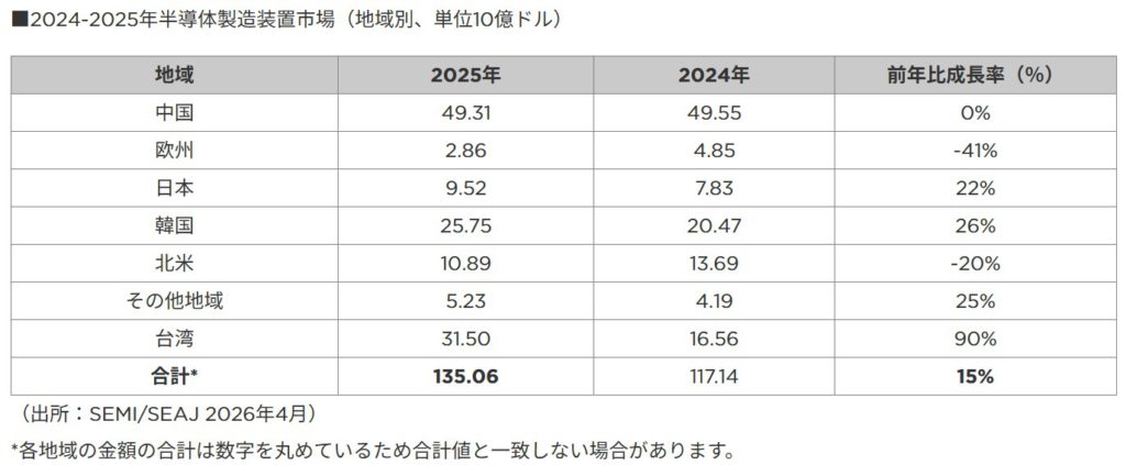 地域別に見ると、2025年の半導体製造装置への投資は引き続きアジアに集中しており、中国、台湾、韓国の合計額が世界市場の79%を占める。これは2024年の74%から5ポイント上昇した数値だ。