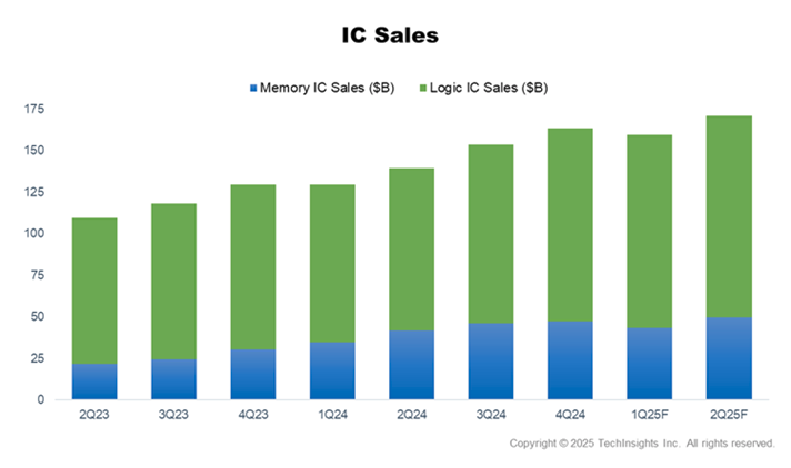 ウェーハファブ装置(WFE)への投資額は、AI半導体利用の急拡大に向けた先進ロジックおよびメモリ生産への投資が活発化したことで、2025年第1四半期に前年同期比19%増加し、第2四半期にはさらに12%の増加が見込まれている。テスト装置の売上は、AIとHBMチップのテストの複雑化と厳しい性能要件を反映して、2025年第1四半期に前年同期比56%増の急成長をしており、第2四半期にも53%増が予測されます。組み立ておよびパッケージング装置も、高集積化と先進パッケージングへの展開からの恩恵で2桁成長を記録している。