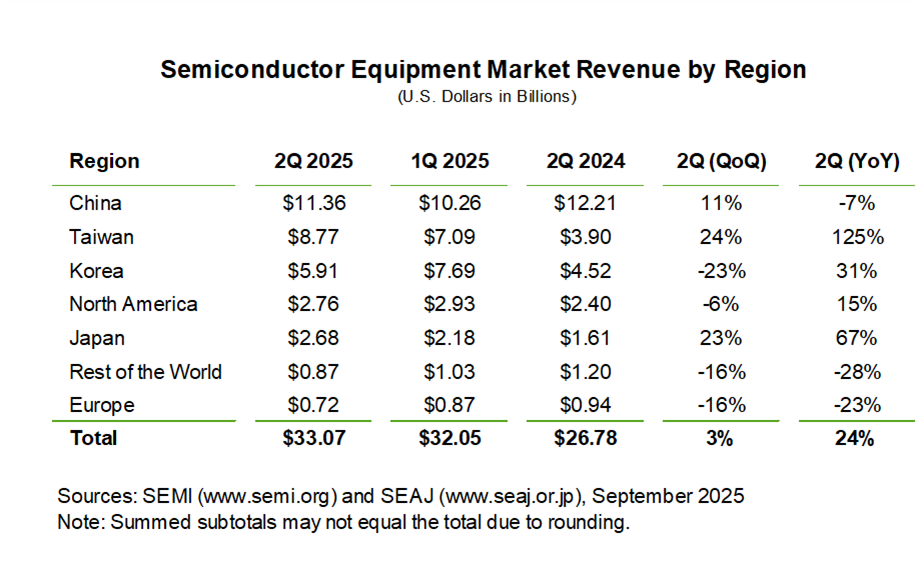 SEMI(本部:米国カリフォルニア州ミルピタス)は、9月4日(米国時間)、2025年第2四半期における半導体製造装置(新品)の世界総販売額が、前年同期比24%増となる330億7000万ドルであったことを発表した。前期比では、先端ロジック、HBM関連のDRAMアプリケーション、またアジアへの出荷増に支えられて3%増となった。このデータの詳細は、SEMIが発行する世界半導体製造装置市場統計(WWSEMS)レポートで提供される。