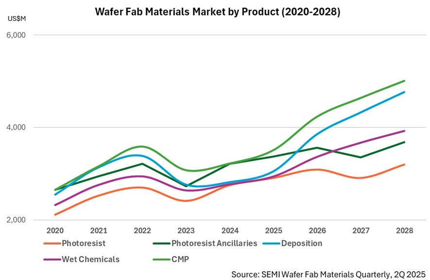 2025年第2四半期(2Q 2025)の初回レポートは、ウェーハファブ材料市場におけるダイナミックな変化を明らかにしており、業界が進む回復軌道は、目覚ましい回復力を実証している。2023年の材料需要低迷を経て、2024年には堅調な成長を成し遂げ、フォトレジストは前年の11%減から一転して14%増となった。