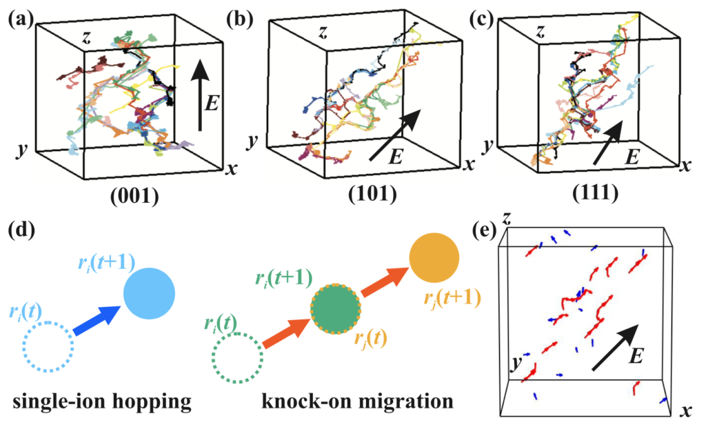(注5) ノックオン機構:原子やイオンが移動する際に、隣の位置にある原子やイオンを押し出すようにして次々と動かす連鎖的な移動のこと。最初の一つの動きが周囲に伝わるため、「ドミノ倒し」のように複数の粒子が協調的に動くのが特徴である。