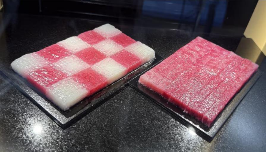 大阪ヘルスケアパビリオンの「家庭で作る霜降り肉」で展示中の培養肉