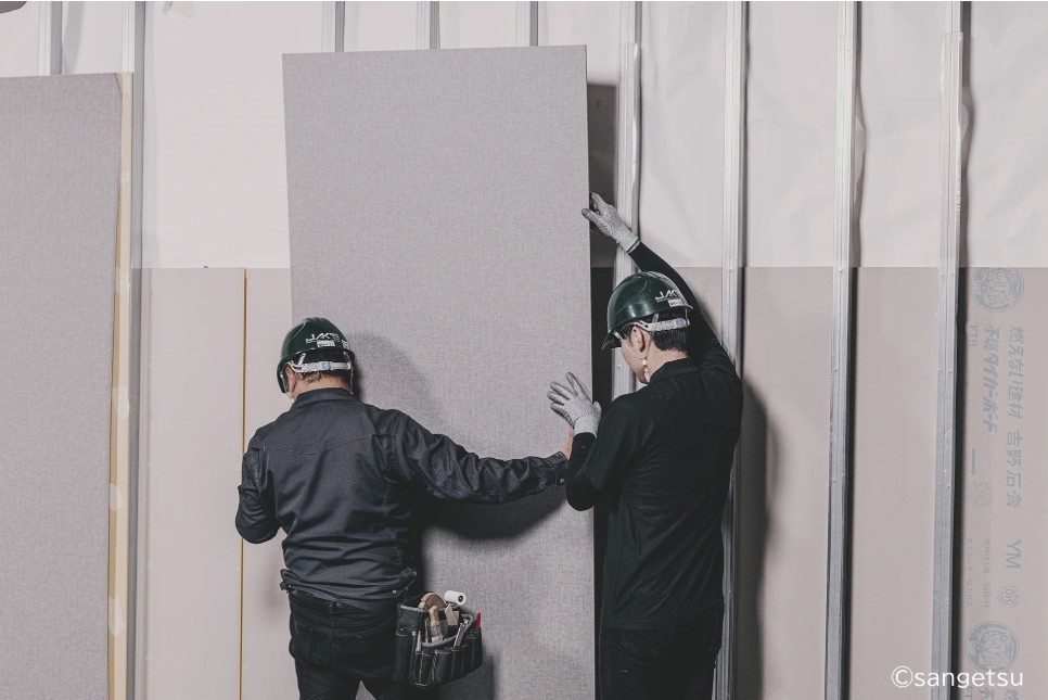 前述の社会課題を背景として、サンゲツは高度な貼合技術を持つフジプレアムと協業し、「INNOVATION(革新)」と「IN NO TIME(あっという間)」をコンセプトに、「INNO PANEL」を開発した。基材には、吉野石膏の石膏ボードを採用し、「スマートJG工法」に関する専門的な知見の共有や安全性評価を含めた連携を行っている。