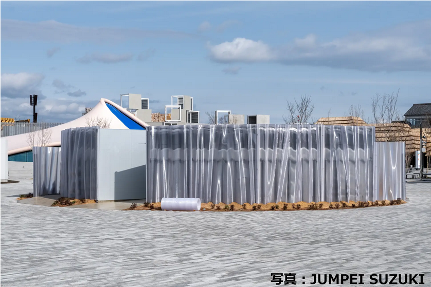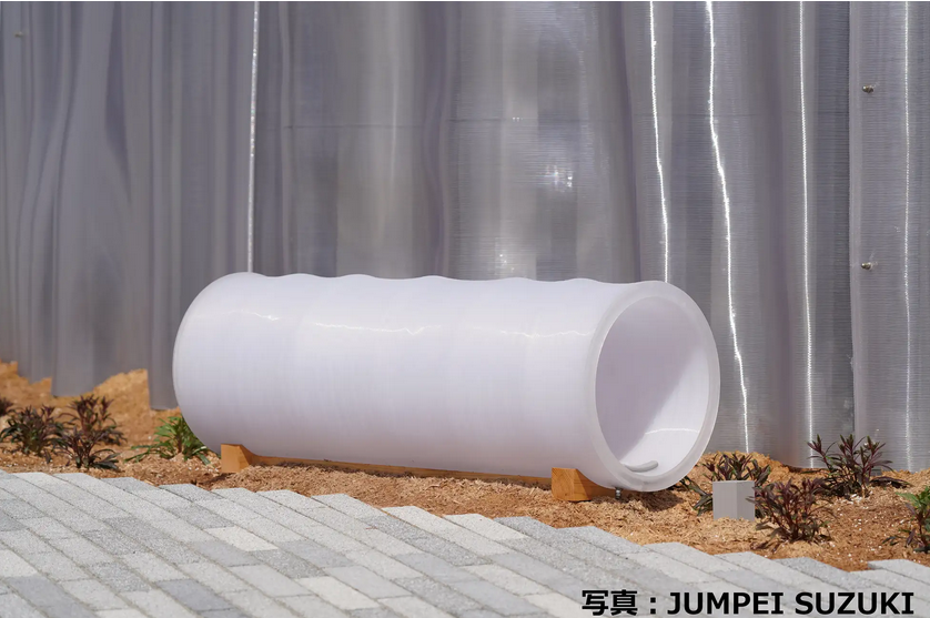 大阪・関西万博では、SDGs(持続可能な開発目標)達成につながる個性豊かで魅力的な博覧会施設の創出を目指し、今後の活躍が期待される若手建築家が休憩所やトイレなど計20施設の設計を担当しています。その一つである、再利用可能な樹脂で製作され、半透明な曲線が特徴的な『島の蜃気楼』(トイレ施設)(図2、3)の周辺に、再生プラスチックを配合したベンチが設置されている。