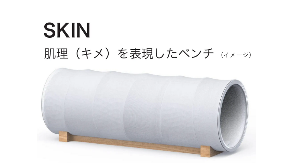 今回製作したベンチデザインは2種類あります。3Dプリンティング成形技術を得意とするVOID(補足資料4)と連携することで、再生プラスチックの配合度合いにより色味がどう変化するかなどの検証を行いながら、視覚的・触覚的な表現も追求しました。デザインの着想は、ポーラ・オルビスグループ独自の化粧品クリームや、研究対象としている”肌”。心地よい感触の秘密である乳化物の形態や、皮膚表面の肌理(キメ)構造をベンチの表面デザインに模し、「触ってみたい」と感じるベンチを目指し作り上げた(補足資料2)。ベンチに座るだけでなく、手触りを楽しみ、肌についてふと考えるきっかけになればと考えている。