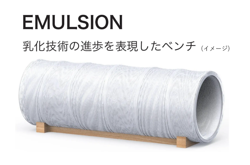 化粧品では、乳化(EMULSION)という技術を用いて、「しっとりしているのにべたつかないクリーム」のような、水だけ・油だけでは実現できない豊かな感触を実現している。ポーラ化成工業が開発したオリジナル乳化物の様子をベンチに模し、身近に使うものの手触りの裏にある技術の奥深さを表現した。